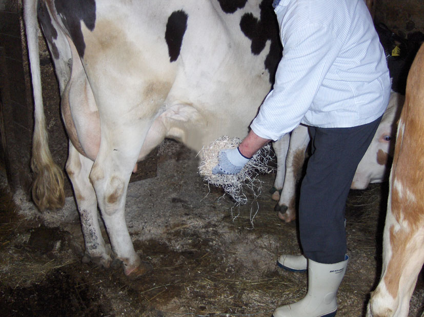 Die Euterreinigung bei den Kühen ist ein wichtiger Bestandteil des Melkens. Aus hygienischer Sicht ist es notwendig die Schmutz- und Kotpartikeln von Zitzen zu entfernen um Milchverunreinigung zu vermeiden, da kommt unsere Euterholzwolle zum Einsatz und liefert ausgezeichnete Resultate. Ein weiterer positiver Effekt des Reinigungsprozesses ist die Stimulation des Euters, was zu dem Ausstoß von Hormon Oxytocin führt und zu einer raschen und möglichst vollständigen Milchabgabe führt. Zudem ist es auch wichtig eine stressfreie Atmosphäre beim Melken zu schaffen, der mögliche Ausstoß der Stresshormone die Milchproduktion hemmt. Euterholzwolle ist eine ganz spezielle dünne Holzwolle hergestellt aus feinem Holz. Besondere Eigenschaften machen die Euterholzwolle gut geeignet die Schmutzpartikel von der Kuhzitze zu lösen ohne einen Stress bei Kuh auszulösen und Euter zu stimulieren. Euterholzwolle ist griffig, mit desinfizierenden Komponenten kombinierbar und keimfrei. Die Euterholzwolle ist ein Einmalprodukt. Es ist nur für eine Reinigung bei einer Kuh zu verwenden um die hygienischen Anforderungen gerecht zu werden. Allerdings werden nur circa 5 Gramm pro Vorgang benötigt. Ein eindeutiger Vorteil der Euterholzwolle ist die Tatsache, dass das ein Naturprodukt ist und sehr einfach zu entsorgen ist , z. B. über Mist. Erfahrungsgemäß werden pro Kuh und pro Jahr 4 bis 4,5 kg Euterholzwolle benötigt. Wir bitten Ihnen Euterholzwolle in Kartons je 500 L, was für zwei Kühen pro Jahr vollkommen ausreichen wird. Die Preis – Leistung Verhältnis ist hervorragend, da Sie mit unserer Euterholzwolle nur einen Betrag Investieren, der lediglich etwas über 1 Cent pro Reinigung liegt, um das optimale Ergebnis beim Melken zu erreichen.